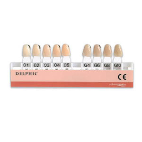 The Delphic shade guide serves to accurately determine tooth shade. 9 shades (5 traditional ‘O’ shades (01-02-03-04-05) which have been specially created to give greater warmth. A contrasting enamel has been incorporated for greater vitality and natural beauty. And 4 'G’ shades G4-G6-G8-G10) which fulfil the requirement for a graduated range of grey shades with exceptionally lifelike appearance. The G10 shade was specially developed by us for senior citizens.