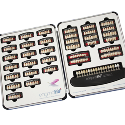 The enigmalife chairside assortment contains all upper anterior tooth moulds, two lower anterior tooth moulds and examples of S and P posterior teeth both upper and lower along with the enigmalife shade guide.