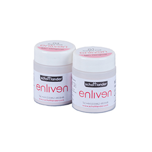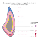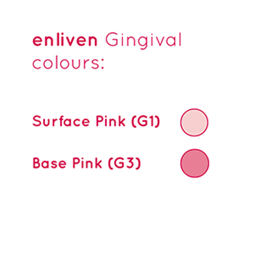 To reproduce the gingiva in ceramic can be a daunting task. There are never enough shades in a kit and most of them remain unused from year to year. enliven MC simplifies the procedure by having just two gingival powders G1 Base and G3 Surface with G3 Surface being blended with an enamel such as IN3 to reproduce the free gingiva. Further characterisation is carried out by using enliven Universal Stains which include three pink and a violet tissue shade. The combination provides a perfect harmonisation with the surrounding tissue.