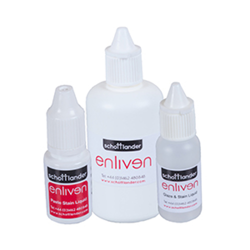 enliven Glaze & Stain Liquid is used both with Glaze Powder and with enliven Stains when used in the more fluid powder stain consistency.