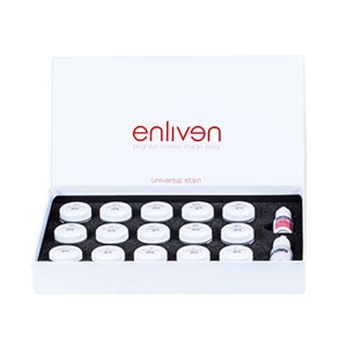 Within the system there is a range of enliven universal stains which are not just used with metal ceramic but with zirconia and titanium ceramic as well. These stains are supplied as powders but, depending on the liquid chosen, can be used as either powder or paste stains as required. To use the material as a paste stain just mix with the paste stain liquid in the kit and keep the material in a covered mixing well for further user later. No longer do you need to buy paste stains and then dispose of the less frequently used colours because they have gone out of shelf life.