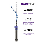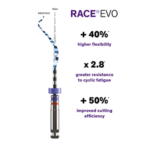 The ultimate evolution of the RaCe rotary system, it combines the proven benefits of original RaCe with proprietary heat treatment and higher rotation speed capability, making RACE EVO instruments even safer, easier to control and more efficient than ever before. RACE EVO gives dentists the freedom to choose their therapeutic approach.